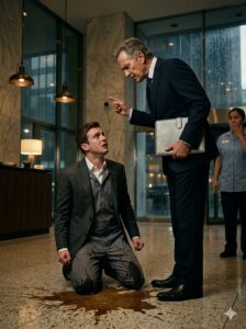 He made her kneel in a puddle of coffee while an entire marble lobby watched in silence.