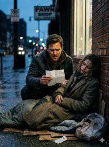 Instead, he noticed movement beside a rusted metal shutter. Not movement, exactly. A shape trying not to be seen. Cardboard pinned down by bricks. A frayed blanket. Two plastic bags swollen with someone’s entire life. The smell hit him a second later—wet fabric, old trash, cold concrete, and the human ache of abandonment.